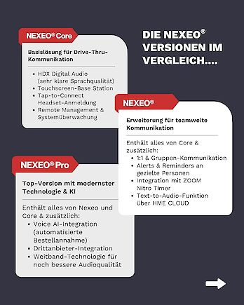 Mit dem NEXEO® Kommunikationssystem von HME verbesserst du deine Drive-Thru-Abläufe spürbar. Dank digitaler Headsets, smarter Funktionen und – je nach Version – integrierter KI-Technologie sorgst du für mehr Effizienz, besseren Service und zufriedene Gäste.